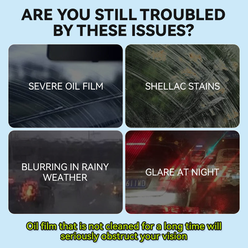 ELIMINACIÓN PODEROSA DE ACEITE: Elimina eficazmente la película de aceite persistente, grasa y suciedad de la carretera en parabrisas y espejos. Restaura la transparencia y claridad de los vidrios del automóvil, garantizando mejor visibilidad y seguridad al conducir en condiciones de lluvia, niebla o de noche.