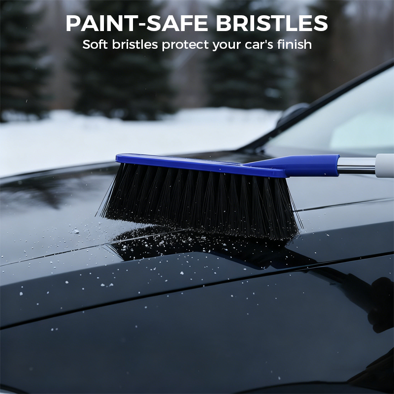Grube, miękkie włosie z rozdwajanymi końcówkami – skutecznie usuwa śnieg bez rysowania lakieru i szyb.