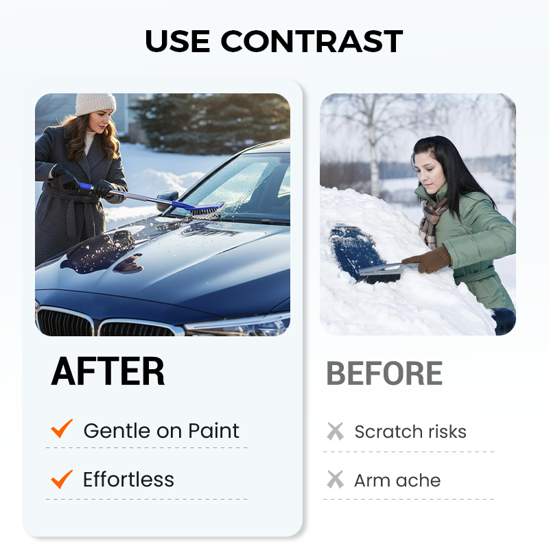 2. Do usuwania śniegu: Użyj szerokiej głowicy szczotki, aby zmiatać śnieg z powierzchni samochodu delikatnymi ruchami w dół.