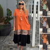 Luźna kolorowa patchworkowa sukienka z krótkim rękawem